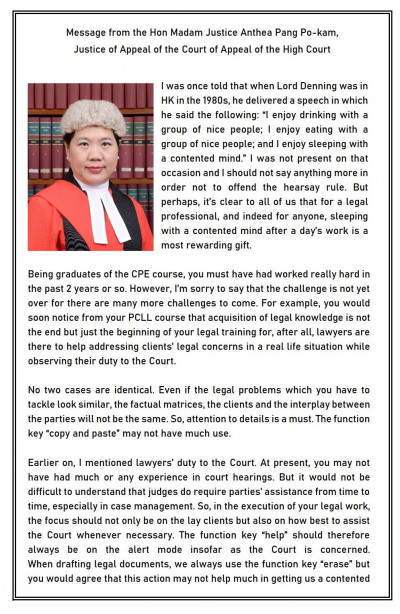 "I would like to convey my warmest congratulations both to you and the others who run this successful CPE programme and to all the graduates. No doubt all of them must have worked very hard to be able to get on the stage of the Graduation Ceremony but there is also no doubt that there will be more challenges ahead in their legal career. However, with stamina and diligence, I am sure that they will all turn out to be successful practitioners with much to contribute to our legal profession in due course.