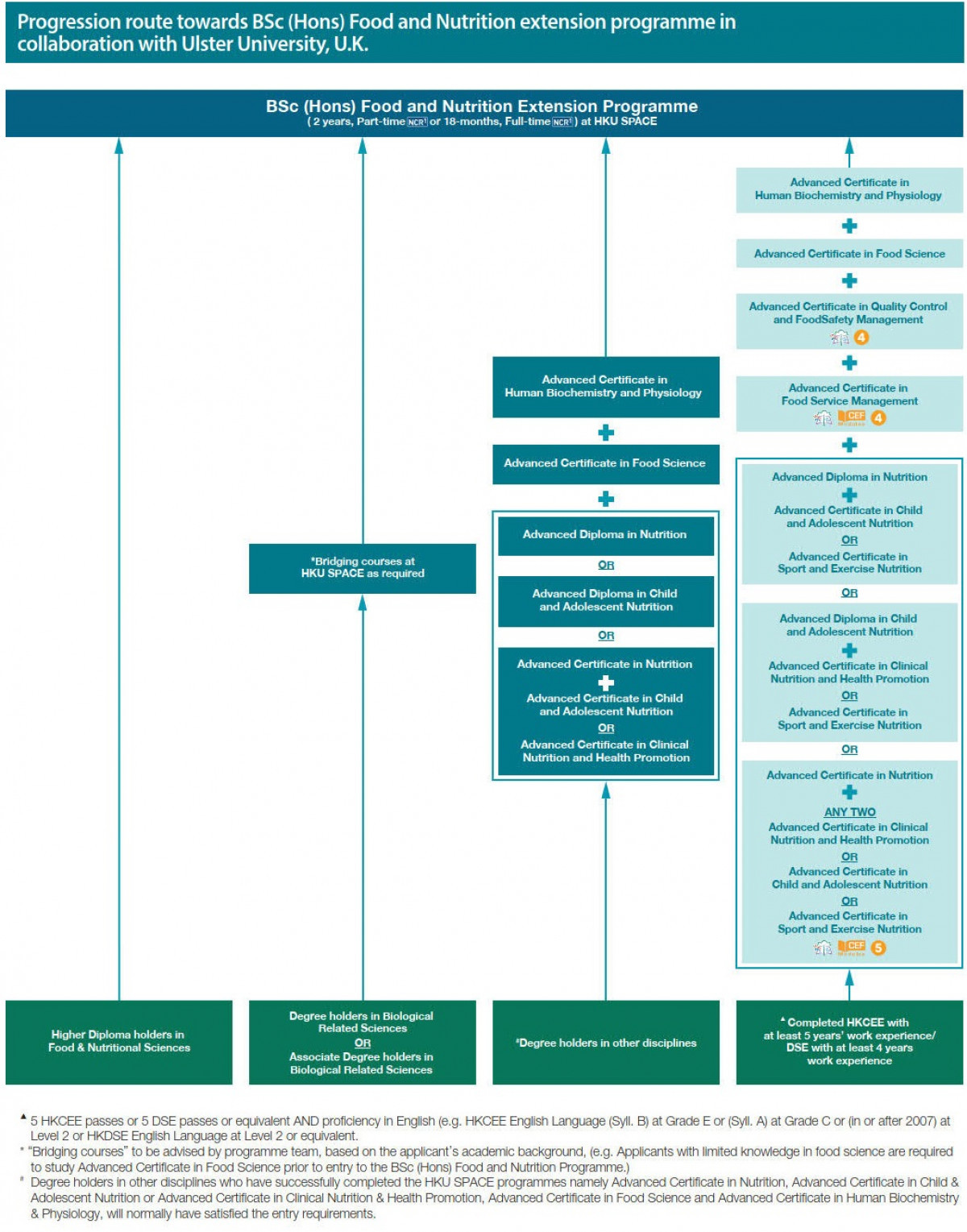 Students who successfully complete the Advanced Certificate in Quality Control and Food Safety Management together with all required HKU SPACE programmes, namely Advanced Certificate in Food Service Management, Advanced Certificate in Human Biochemistry and Physiology, Advanced Certificate in Food Science, Advanced Certificate in Nutrition and any two of Advanced Certificate in Clinical Nutrition and Health Promotion, Advanced Certificate in Child and Adolescent Nutrition and/or Advanced Certificate in Sport and Exercise Nutrition and other bridging courses are eligible to apply for entry into the two years part-time BSc (Hons) Food and Nutrition extension programme offered by HKU SPACE in collaboration with Ulster University, UK. (Details refer to Progression Path)