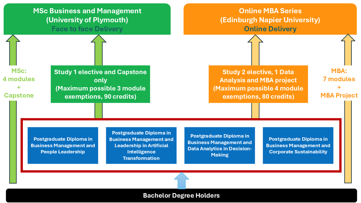 Receive a maximum possible of 90 credits exemption from the programme Master of Science Business and Management (awarded by the University of Plymouth) and only need to complete the elective module and Capstone Project.